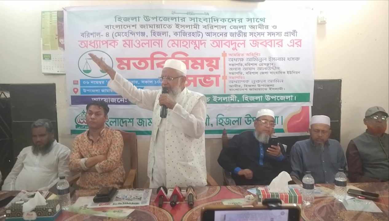 বরিশালের হিজলায় সাংবাদিকদের সাথে মত বিনিময় করেছেন বরিশাল-৪ আসনের জামায়াতে ইসলামী প্রার্থী, হিজলা উপজেলা জামায়াতে ইসলামীর আমির অধ্যাপক নুরুল আমিনের সভাপতিত্বে, উপজেলা জামায়াতের দলীয় কার্যালয় মত বিনিময় সভা অনুষ্ঠিত হয়। সভায় উপস্থিত ছিলেন জামায়াতে ইসলামীর বরিশাল জেলা আমীর, অধ্যাপক মাওলানা মোহাম্মদ আব্দুল জব্বার। এ সময় সাংবাদিক নানান প্রশ্নের উত্তর জামায়াত নেতা, বলেন সাংবাদিকদের লেখনীর মাধ্যমে সাংবাদিক সহযোগিতা প্রয়োজন। সাংবাদিক সমাজের দর্পন। সমাজের নানা অসঙ্গি সাংবাদিকদের মাধ্যমে সারা বিশ^ দেখতে পায়। তিনি বলেন সমালোচনায় আমরা ব্যথিত হই না, বরং আনন্দিত হই। আল্লাহ চাহেতো জামায়াতে ইসলামী ক্ষমতায় গেলে হিজলা মেহেন্দিগঞ্জ, কাজিরহাট মানুষের উন্নয়নে কাজ করব। অবহেলিত জেলে, চরাঞ্চলের মানুষের ভাগ্য উন্নয়নে কেউ কাজ করেনি। ৫৫ বছর নয় ৫ বছরেই দেশের চেহারা পাল্টানো সম্ভব। দূর্নীতির কারনে দেশে উন্নয়ন হচ্ছে না। ফ্যাসিষ্ট হাসিনা সরকারের দূর্নীতি এখনও চলমান। এ থেকে উত্তরণের জন্য আমাদের ভালো সৎ মানুষের প্রতিনিধিত্ব করার জন্য সংসদের পাঠাতে হবে। আমরা সকলে মিলে দেশটাকে সিঙ্গাপুর বানিয়ে দিতে পারব ইনশায়াল্লাহ। ডাকসু, রাকসু, চকসু, জাকসু ছাত্র সংসদ নির্বাচনের ফলাফল দেখিয়ে বলেন যারা ভোগ দিয়ে ছাত্র শিবিরকে জিতিয়েছে। তারা সবাই শিবির করে না। তারা শিবিরের সমর্থক ভোটার। সততা, নিষ্ঠা, ভালবাসায় তারা ভোট দিয়েছে। অনুরুপ ভাবে সারা দেশে মানুষ আজ ভালো মানুষকে, সৎ নিষ্ঠাবান, আদর্শবান মানুষকে ভোট দিবে। একটি জরিপে দেখাগেছে ৬২ শতক মানুষ সময়ের বিবেচনা এদিক সেদিক ভোট দেয়। এবার জাতীয় নির্বাচনে এই মানুষগুলোর ভোট আমরা পাব ইনশায়াল্লাহ। এ সময় উপস্থিত ছিলেন বরিশাল প্রেসক্লাবের সভাপতি অধ্যক্ষ আমিনুল ইসলাম খসরু, বরিশাল জেলা সাংবাদিক ইউনিয়নের সভাপতি দৈনিক বাংলাদেশ বানী’র সম্পাদক আযাদ আলাউদ্দিন, অনুষ্ঠানটি সঞ্চালনা করেন, উপজেলা জামায়াত সেক্রেটারী ও বাংলাদেশ বাণীর ব্যবস্থপনা সম্পাদক সৈয়দ গুলজার আলম, ব্যবস্থাপনা সম্পাদক মোজাম্মেল হক ভূইয়া, জামায়াতে নেতা শাহানশাহ চৌধুরী সামু প্রমুখ।,